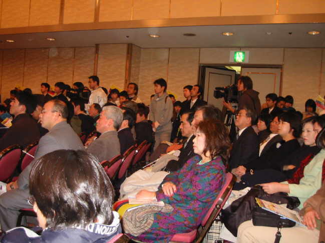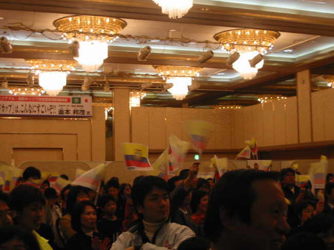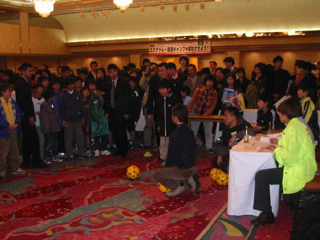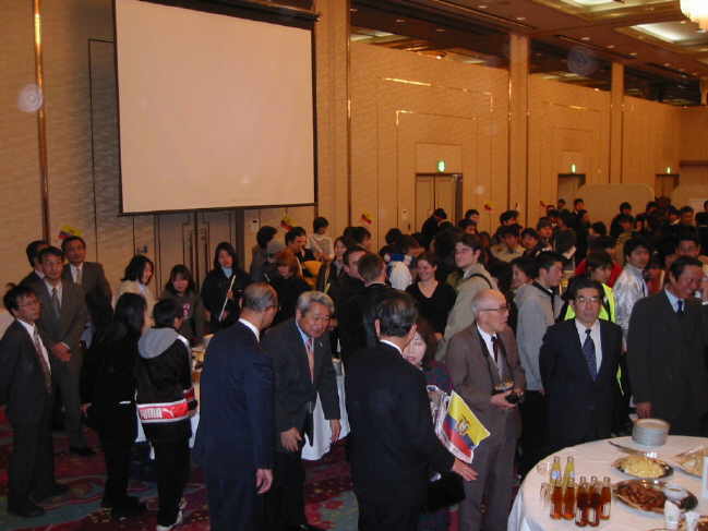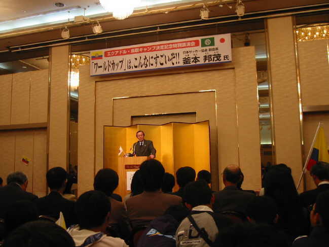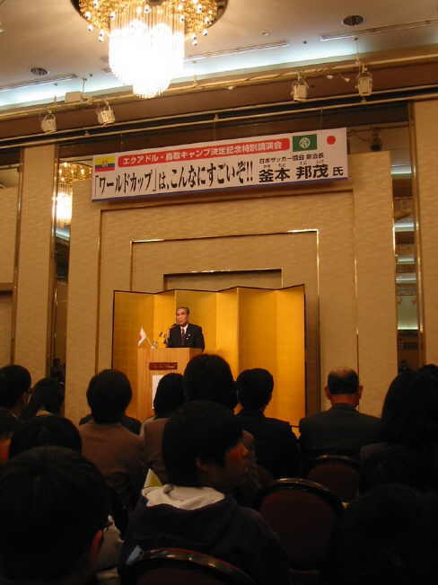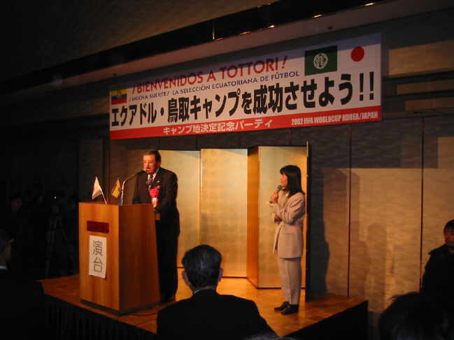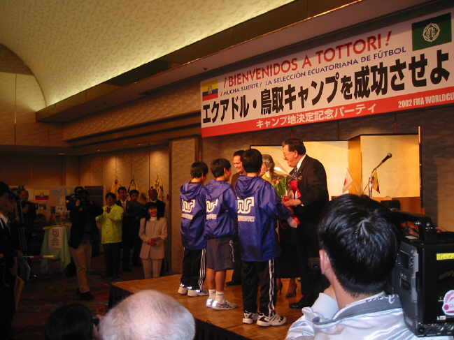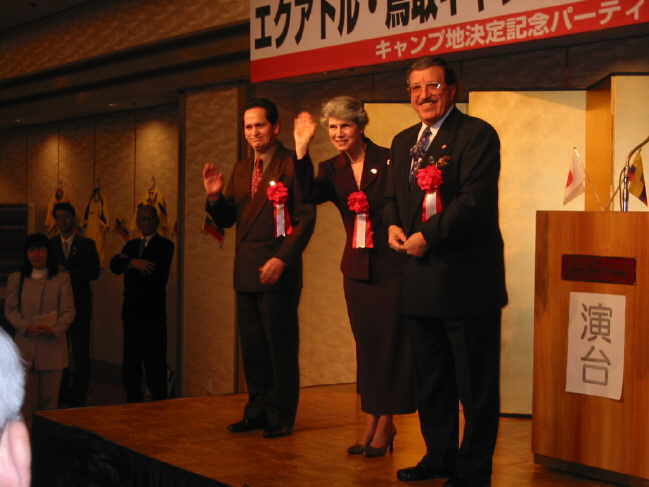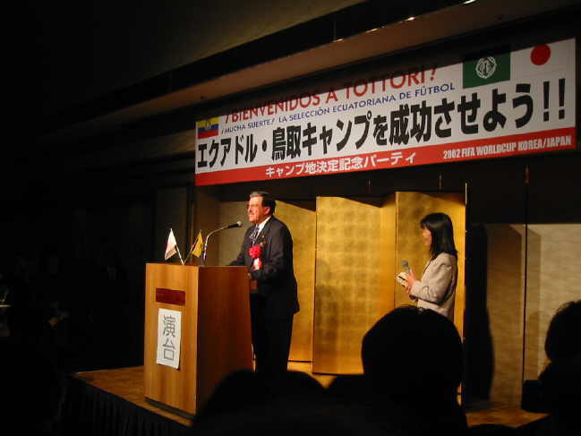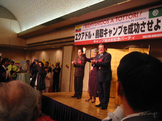 Am Donnerstag, dem 7. März 2002 fand im Hotel New Otani in Tottori der offizielle Besuch des ekuadorianischen Botschafters aus Anlaß der Vertagsunterzeichnung zwischen dem ekuadorianischen Fußballverband und der Stadt Tottori statt. Die Veranstaltung war öffentlich und wurde von gut 800 Einwohnern Tottoris besucht. Es gab eine Gastrede von Herrn Kamamoto, eines ehemaligen Nationalspielers der japanischen Olympiamannschaft von 1968, welche die Bronze Medaille gewonnen hatte. Danach war ein Empfang mit Essen & Trinken angesagt bei der auch der Botschafter ein paar Worte zum besten gab. |