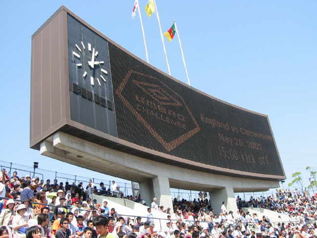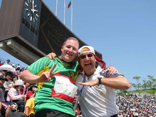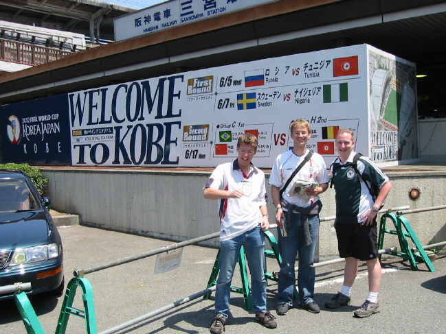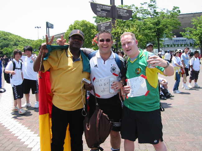 Die Stadt ist schon vorbereitet auf die WM. Allerdings fand das heutige Spiel nicht im neu erbauten Kobe Wing Stadion statt, was eigentlich schade war, da es ein klasse Stadion ist, sondern im University Stadion, das nur 20 Minuten vom Zentrum entfernt lag. Bert und Tom hatten natürlich ihr England Shirt an, während ich Joel mit einem deutschen Trikot versorgte, damit wir kontra geben konnten. Er kaufte sich danach auch ein Trikot von Kamerun. |
