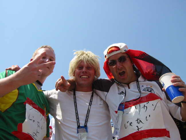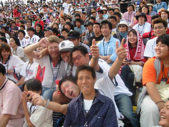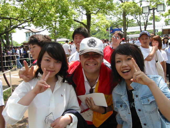 Am Eingang zum Stadion mussten wir uns eine Weile anstellen, was ich natürlich gleich zur Internationalisierung nutzte. Die zwei Mädels kamen aus der Hyogo Prefäktur und waren natürlich scharf auf Beckham, der aber nicht auflaufen sollte. Ich war hier schon recht happy drauf, wie man unschwer an meinem intelligenten Gesichtsausdruck sehen kann! |