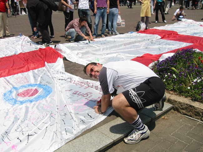 Am Stadion trafen wir auf ein paar England Fans, die zwei riesige Flaggen ausgebreitet hatten auf denen jeder unterschreiben konnte. Da liess ich mich natürlich nicht lumpen!! |