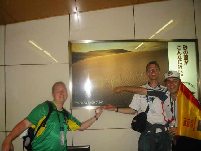 Nach dem Spiel hatten wir alle etwas den Sonnenbrand und waren auch ein wenig angeschlagen. Dennoch erspähten wir in der U-Bahn in Kobe unsere Heimat Tottori wieder. Die Sanddünen von Tottori sind eben in ganz Japan bekannt und es wird auch kräftig Werbung dafür gemacht!! |