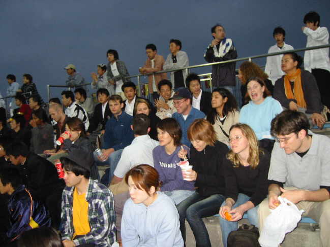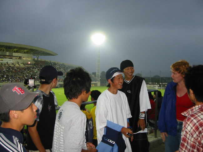 Vor dem Spiel traf so ziemlich jeder unserer JETs seine Kids, welche er unterrichtet. Auch Johanna fand ihre Englischklasse, die zufälligerweise auch meine Fußballmannschaft ist, welche ich zweimal die Woche an der Nakanogo Chugakko (Mittelschule) unterrichte. |