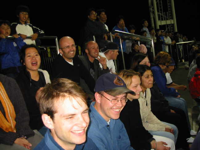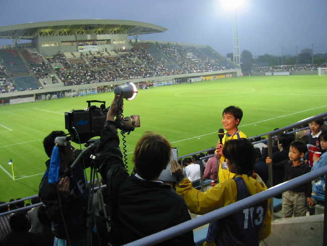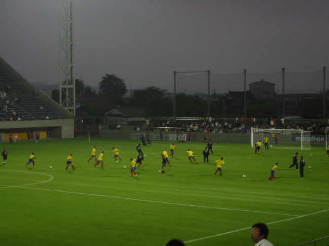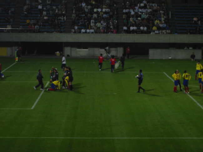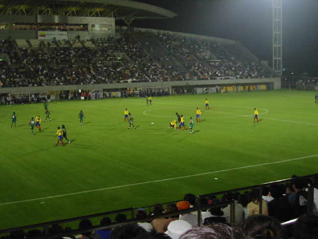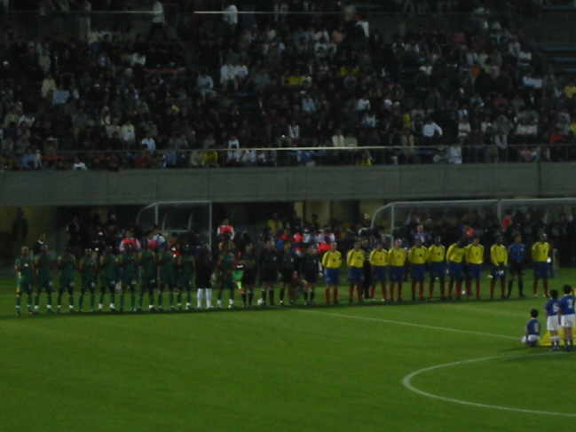 Am Donnerstag Abend, den 23.Mai 2002 fand in unserem Bird Stadium in Tottori City das erste Länderspiel in dieser Gegend statt. Leider wollten es nur 8500 Leute sehen, was mich doch entäuscht hatte, wenn man bedenkt, das so eine Möglichkeit nicht wiederkommt!! Mag aber auch sein, das es etwas am Termin lag, an einem Arbeitstag. Dennoch hatte ich für 23 JETs Karten besorgt und wir saßen alle zusammen auf der Tribüne und genossen das Spiel, auch wenn es kein besonders spannendes Spiel war. Es wurde durch ein Eigentor eines ekuadorianischen Spielers in der zweiten Halbzeit entschieden. |