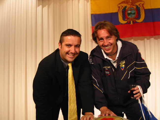 Meine zwei Damen aus dem Büro fanden Ivan Kaviedes, einer der jungen Stürmer, sehr nett und wollten deshalb unbedingt ein Foto mit ihm haben. So hab ich ihnen den Gefallen dann auch gemacht und ihn angequatscht. Er ist allerdings sehr schüchtern und man konnte ihm ansehen, das er den ganzen Rummel und die Veranstalltung nicht so mochte, so das er eher in der Ecke stand und darauf wartete, das dass ganze sein Ende nahm. |