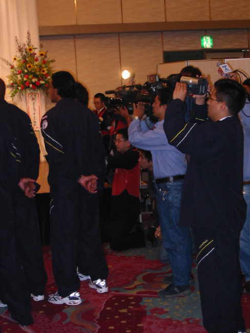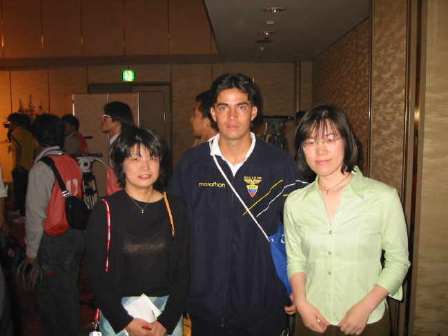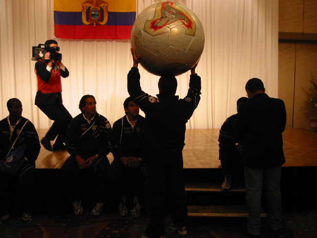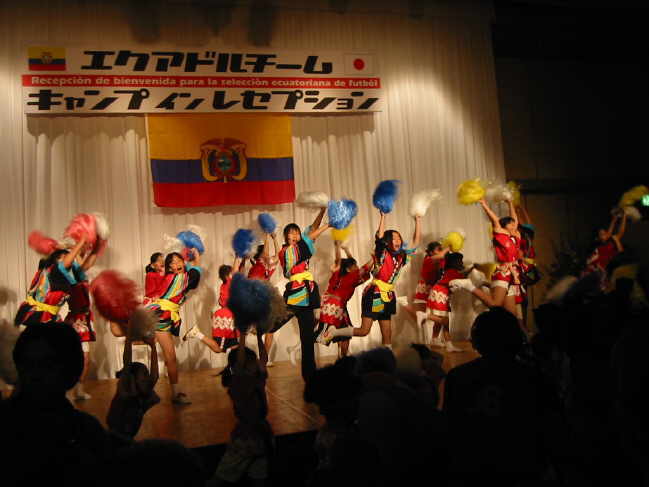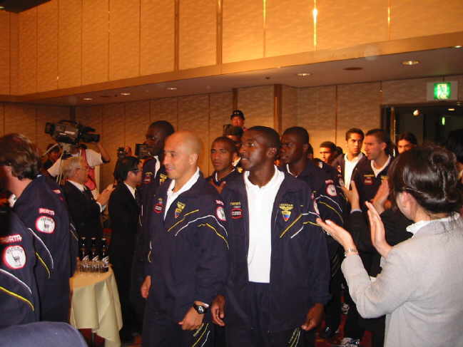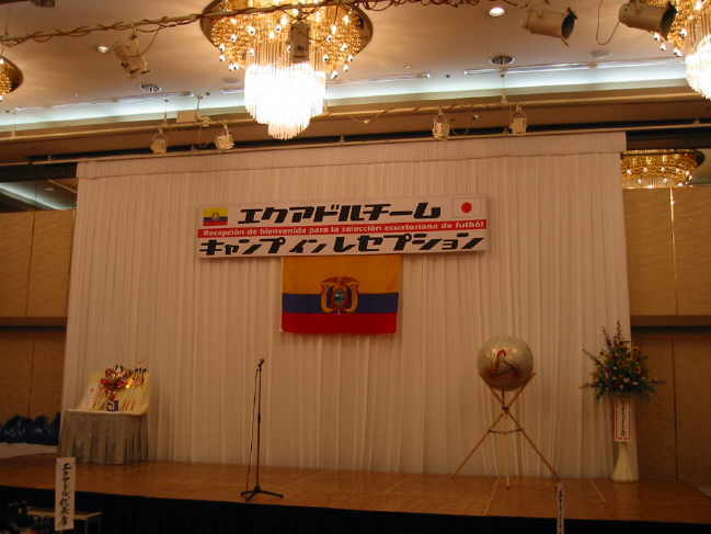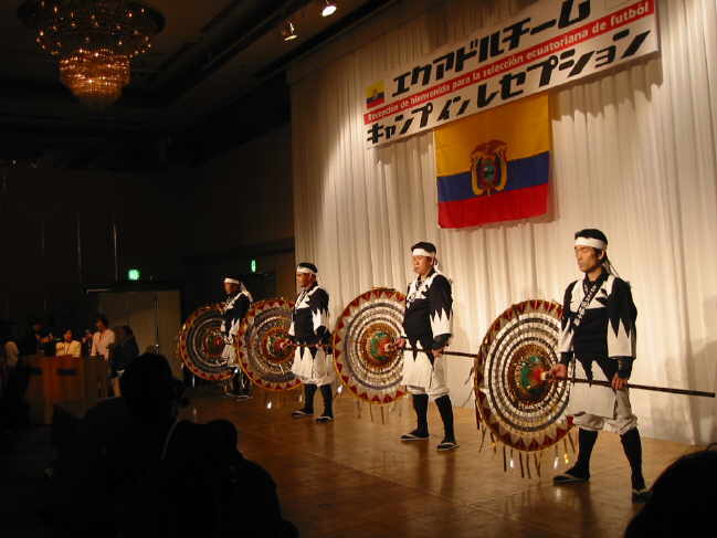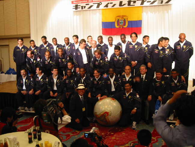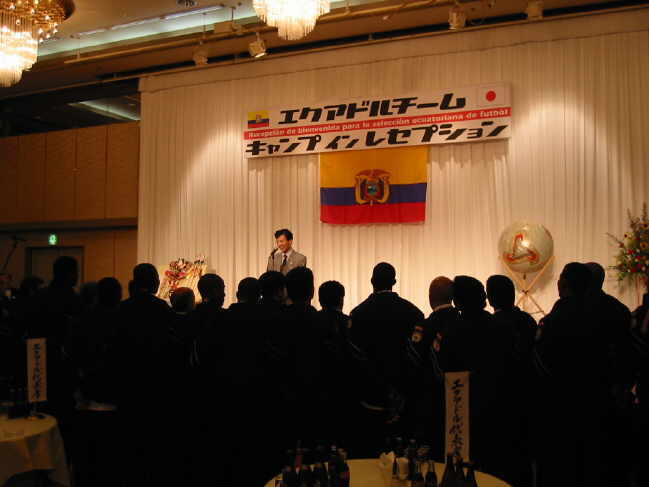 Am Dienstag, dem 21. Mai 2002 war es im Hotel New Otani in Tottori endlich so weit!! Der offizielle Empfang der ekuadorianischen Nationalmannschaft stand auf dem Programm. Knapp 150 Auserwählte durften 7000 Yen abdrücken (gut 60 Euro) um dem Spektakel beizuwohnen. Das Team war zwei Tage vorher in Tottori gelandet und hatte sich im Hotel Sunlight in der Nähe von Shikano einquartiert. Die gesamte Delegation samt Spieler beläuft sich auf 75 Personen. Für Ekuador ist es die erste Weltmeisterschaft und laut Coach Gomez geht man hier auch nicht unbedingt mit großen Hoffnungen ins Rennen. Das ganze ist eher ein Lernprozess. Der zweistündige Empfang mit Reden, Buffet und Folklore war jedenfalls ein voller Erfolg!! |