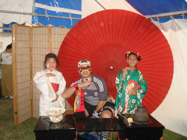 In einem kleinen Zelt hatten sie eine Teezeremonie Vorführung, zu der ich leider zu spät kam. Mit den zwei kleinen Mädels durfte ich dann allerdings noch ein Foto schiessen. Diese Pose wird Euch in Deutschland absolut nichts sagen, doch in Japan kennt sie JEDES Kind. Sie stammt von einem Komiker namens Ken Shimura und gehört zu einem Lied namens “AIN” und ist überall bekannt. Die Kids lieben es und wenn man das als Ausländer macht, liegen sie fast am Boden und kriegen sich nicht mehr...deshalb alle zusammen. “ AIIIIIIIIIINNNNNNNNNNNN!!!!” |