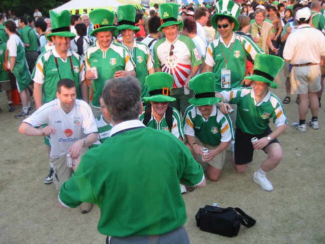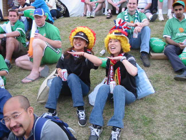 Eine nette Japanerin gesellte sich dann auch zu dem ganzen Reigen, doch ging sie in dem ganzen Trubel auch hoffnungslos unter. Ich wurde derweil von den Iren “niedergehämmert”!!! War wirklich ein spaßiger Nachmittag vor dem Spiel!! |