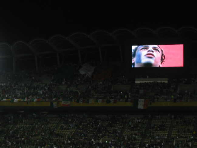 Auch auf der Großbildleinwand waren die Fans präsent. Das Stadion war fast ausverkauft mit seinen 38.800 Zuschauern. Knapp 42.000 passen hinein. |
