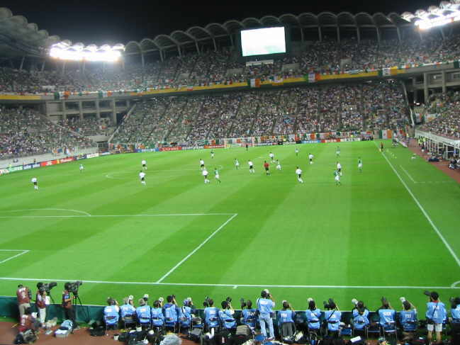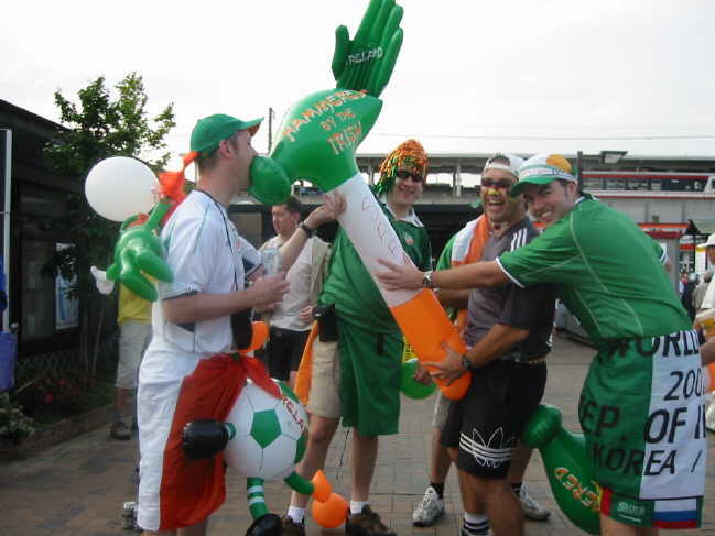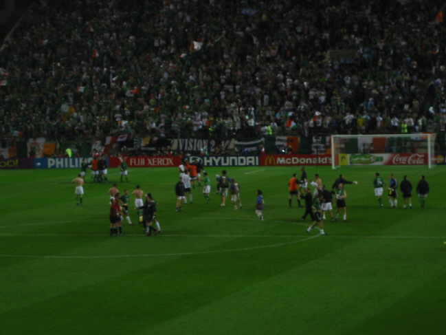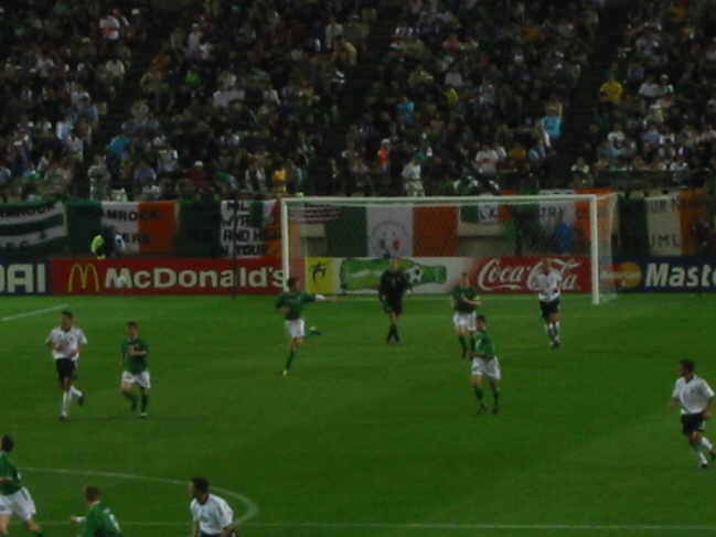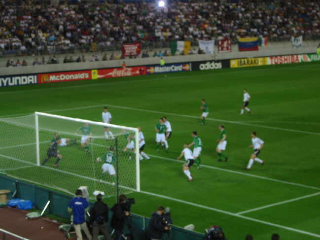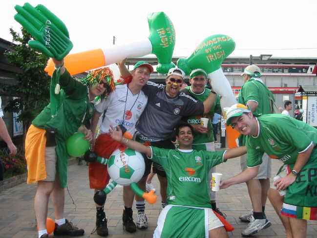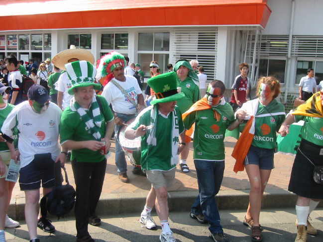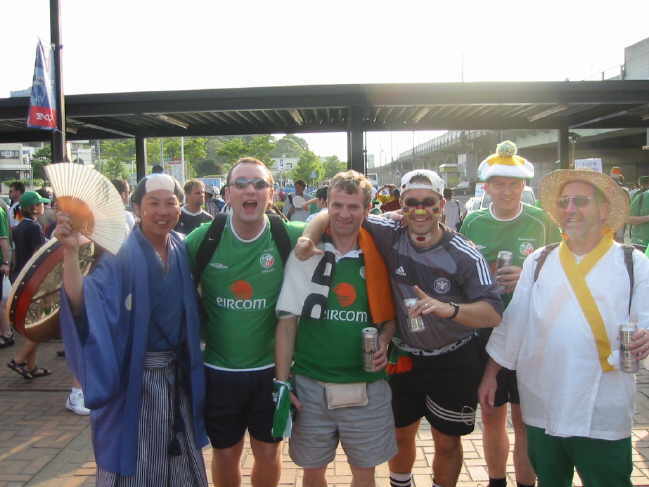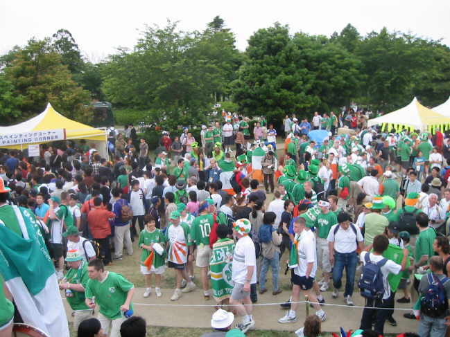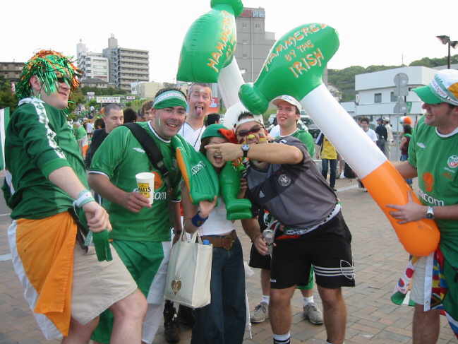 Die Iren waren einfach super organisiert und ausgestattet, da konnte man als Deutscher schon etwas neidisch werden. Leider ist es so, das wenn man im Ausland ist und bei einer WM auf deutsche Fußballfans trifft, diese nicht immer ganz zur geistigen Elite des Landes gehören (mal vorsichtig ausgedrückt). Da sind schon manche Bauern dabei. (Hey, ich hab ganz sicher nix gegen die Deutschen, is aber nun mal die Tatsache) Bei den Iren hatte ich das Gefühl, das da selbst einflußreiche Geschäftsmänner und Chefs mit nach Japan gekommen waren, so wie ich mich mit einigen unterhalten konnte. Da ist die Unterstützung der Fans einfach viel größer. Obwohl ich nach dem Spiel am Taxistand auch auf zwei irische Bauern traf, anyway, verallgemeinern kann man das eben doch nicht. |
