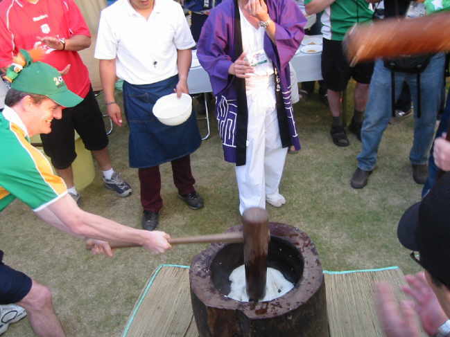 Die Japaner boten alle möglichen Attraktionen an. Hier durften zwei Iren zusammen Mochi stampfen, welches oft in Japan gegessen wird und aus gestampftem Reis hergestellt wird. |
