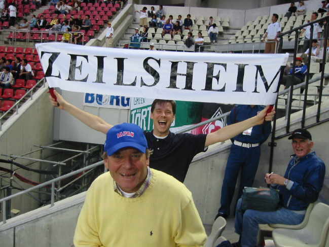 Im Stadion traf ich dann wieder auf die Jungs aus Sapporo. Auch der Typ mit seinem Zeilsheim Schild war wieder da. Er hatte bereits Schlagzeilen zu hause gemacht! Im Vordergrund ist sein Vater, der hier in Tokyo arbeitet. |