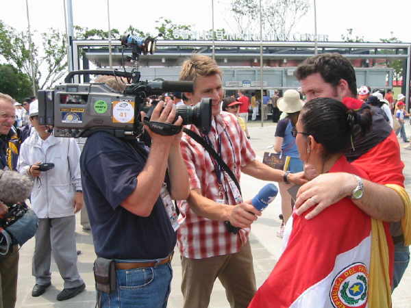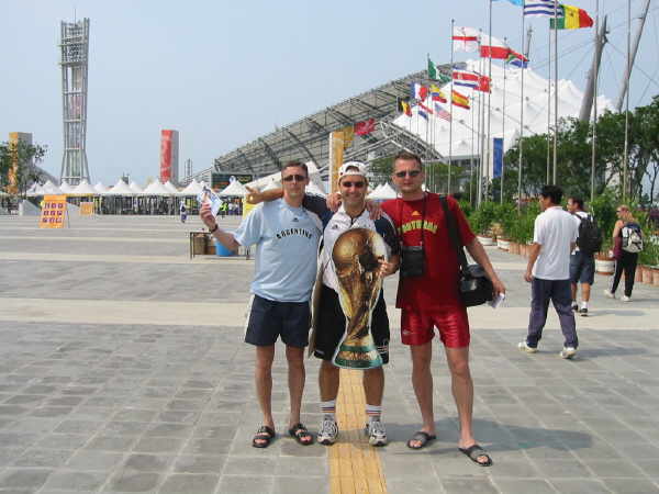 Eine der ersten Fans, die meinen geilen Pokal erspät hatten und schon zu so früher Stunde am Stadion waren, waren ein Russe im Portugal T-shirt, sowie ein Slowene im Argentinien Dress!!! Diese WM wird auch ohne Zweifel als die WM der Überläufer eingehen, denn die meisten Top Teams hatten nix zu lachen nach der Vorrunde! Mal abgesehen von jedem Japanern, der sowieso jedes Team unterstützte und wohl auch alle 32 Trikots der Teams zu hause hatte, habe ich noch Engländer Senegal unterstützen sehen und Holländer die Iren!!?? |