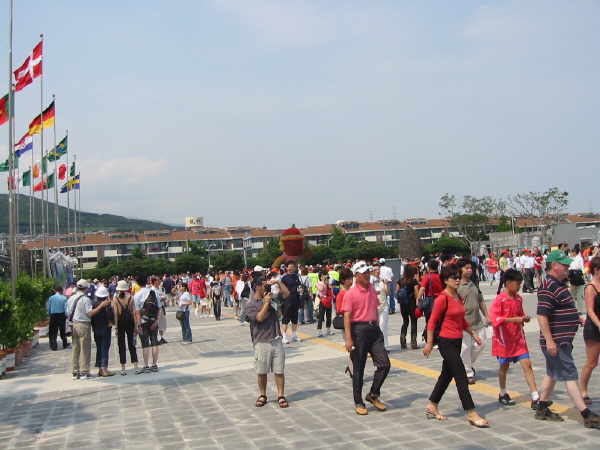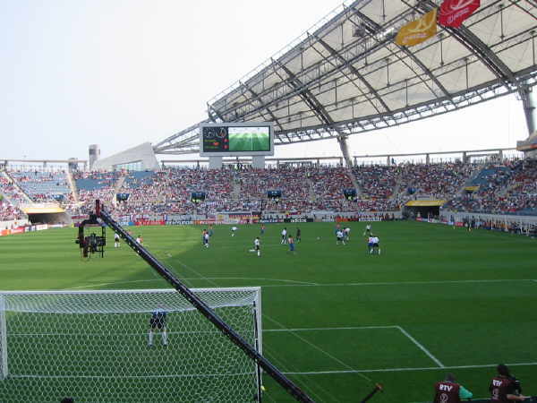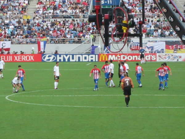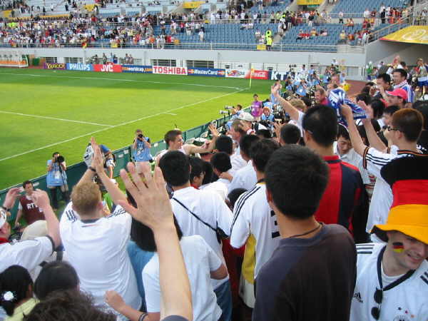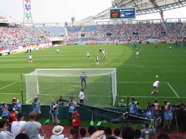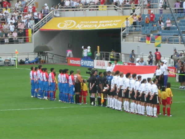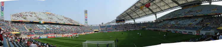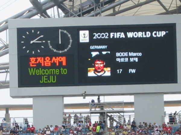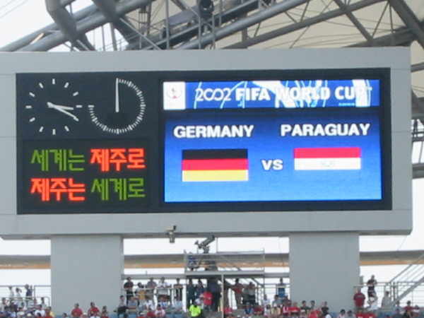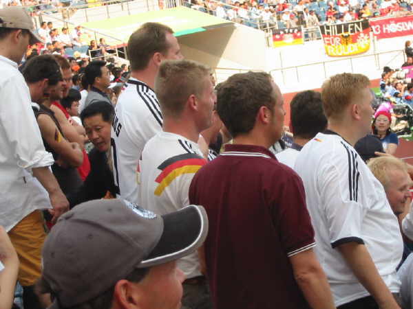 Das Stadion in Jeju war wirklich klasse und ich muß sagen, dass ich richtig entäuscht war, nur 25.000 Leute im Stadion anzutreffen!! Außer uns gab es kaum Stimmung auf den Rängen, bis auf ein paar Mädchenschulklassen, denen man Karten zum Spiel geschenkt hatte und die ständig ihr “Dae han min guk” zum besten gaben!! |