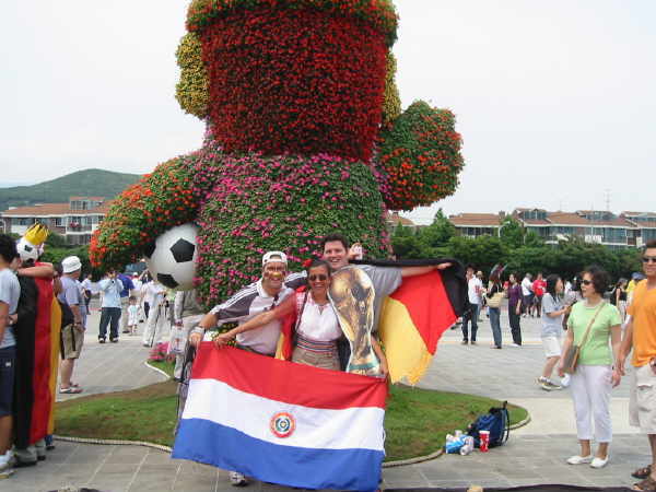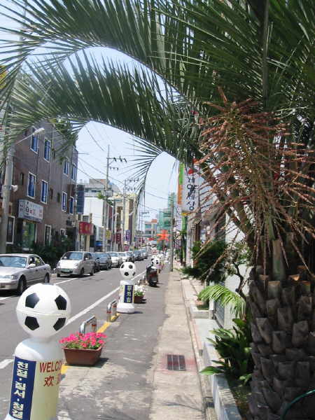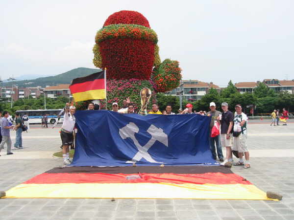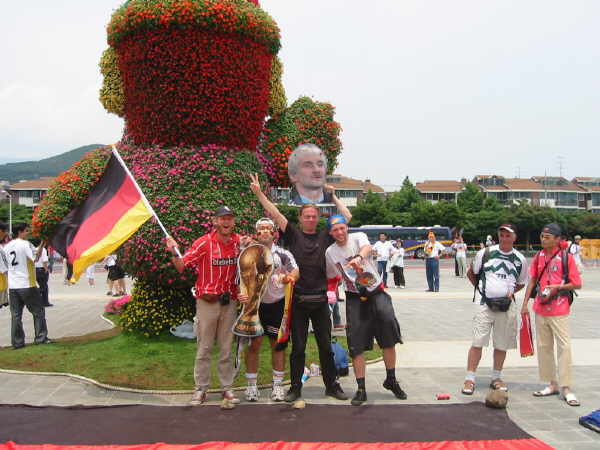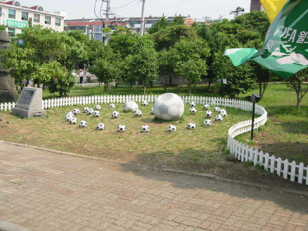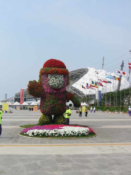 Direkt auf der gegenüberliegenden Seite des Stadions lag neben der Ampel dieser kleiner angelegte Fußball-Garten. Fand ich eine recht hübsche Sache. Auch konnte man auf der ganzen Insel verschiedene Blumenarrangements zur WM finden. Man konnte sehen, dass die Koreaner mit vollem Herzen bei der WM dabei waren!! |