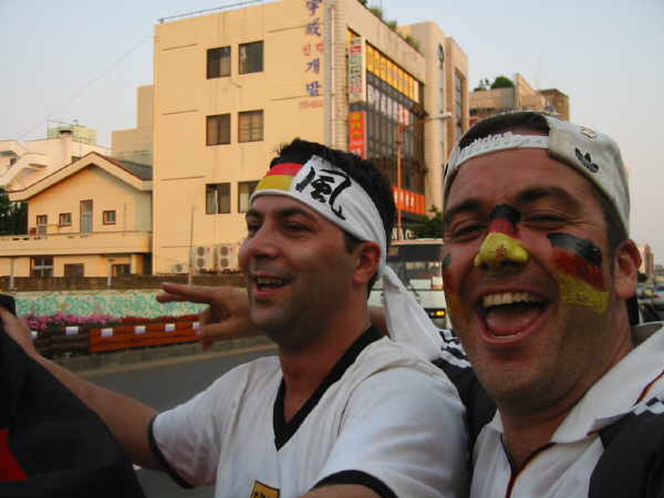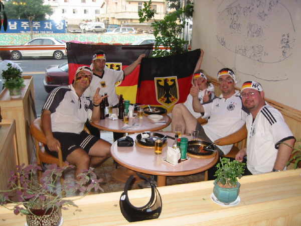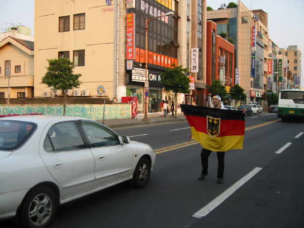 Dann ging es danach auch schon nach Seogwipo rein um dort noch etwas abzufeiern. In einer Pizzeria traf ich auf ein paar Deutsche, wobei der eine die ganze Zeit auf der Straße den Verkehr aufhielt und die Fahne schwenkte!! |