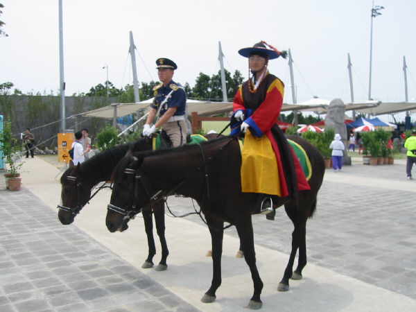 Auch die koreanische Polizei war hier vertreten und dies hoch zu Ross und in traditioneller Montur. Sehr hübsch anzuschauen, doch für den Nachmittag ganz sicher extrem zu heiß!! |