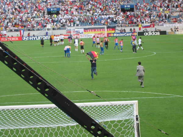 Das Beste kam dann noch zum Schluß, als sich ein besoffener Deutscher doch tatsächlich über die Absperrung wagte und über das KOMPLETTE Feld rannte, bevor ihn ein Polizist überwältigen konnte!! Nicht gerade ein gutes Zeugnis für die Sicherheitsbestimmungen im Stadion. Auch mein Rucksack wurde da nur halbherzig durchsucht! |