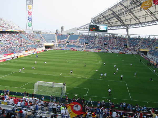 Und los gings!!...mit einem halbvollen Stadion. Noch vor dem Spiel hatten sie Karten an ein paar koreanische Schulklassen verschenkt, die dann auch lautstark ihre Unterstützung gaben...jedoch für das koreanische Team!!!! Da mussten wir als Deutsche natürlich gleich dagegen halten. |