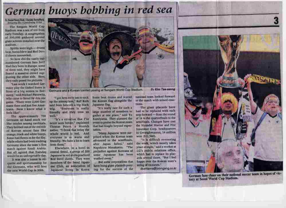 Hier zwei Zeitungsauschnitte aus zwei englischsprachigen Tageszeitungen in Südkorea. Beim linken Bericht wurde ich von der Kanadierin Daniela SantaMaria interviewt, die für die Zeitung “JoongAng Ilbo” einen Bericht schrieb. Der rechte Fotoausschnitt stammt vom Korea Herald, den ich selber ausschnitt, nachdem ich die Zeitung am Tag nach dem Halbfinale auf dem Rückflug nach Osaka/Japan im Flugzeug in die Hände bekam. |