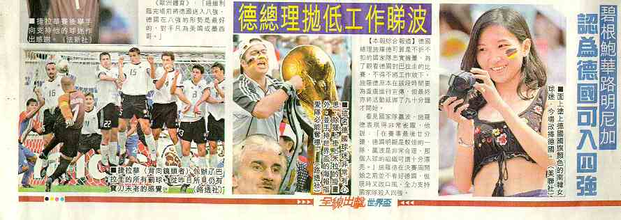 Diesen Zeitungsauschnitt aus einer Tageszeitung in Hong Kong wurde mir von dem netten Mädel rechts neben mir zugeschickt. Sie heißt Pui Yiptin, ist Hong Kong Chinesin, spricht aber sehr gut englisch und ich traf sie und ihre Freundin vor dem Stadion während meines drei Stunden Fotomarathons. Auch sie wollten ein Foto mit mir machen. Nach dem Spiel traf man sich erneut in einem englischen Pub in der Innenstadt von Seogwipo und schaute sich zusammen das Spiel Dänemark-England an. Eine Woche später bekam ich den Ausschnitt zugeschickt. Bin also weltweit vertreten gewesen :-) |