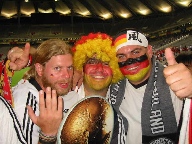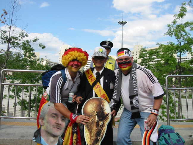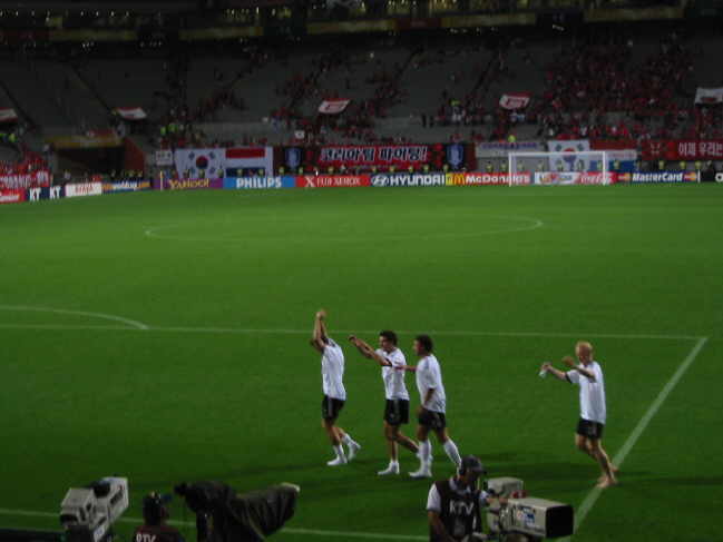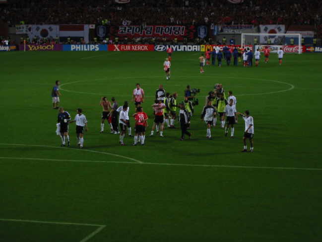 Und dann machte ich mich auch schon auf den Weg zu meinem Platz. Ich saß ja zum ersten Mal auf meinem angegebenen Platz, welcher weit oben unter dem oberen Tribünenrang lang. War wohl der schlechteste Platz aller Spiele, wenn man einmal von Spielfeldnähe und deutschen Fans ausgeht. Ich war von koreanischen Fans umgeben und saß direkt neben der Treppe. Außerdem waren die Sitze ziemlich Scheisse, da sie immer nach oben klappten, wenn man mit den Füßen draufstand. In all den anderen Stadien stand ich auch immer das gesamte Spiel über auf den Sitzen, was nie ein Problem war, doch hier musste man wirklich aufpassen, sich nicht den Hals zu brechen. Dennoch konnte ich das Spiel ohne Probleme verfolgen. Die letzten 5 Minuten des Spiels war ich eh ganz vorne am Spielfeld und rannte mit meinem Pokal auf einem Gang hin und her und nervte die Koreaner ein wenig, bis mir einer aus Frust über die Niederlage die Perrücke vom Kopf zog!! Tat meiner Stimmung aber keinen Abbruch und und wir feierten nach Schlußpfiff wieder über eine Stunde im Stadion!! |
