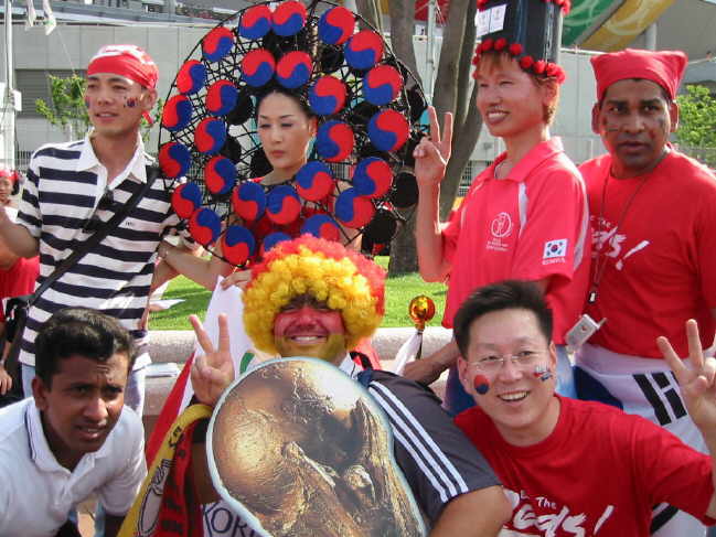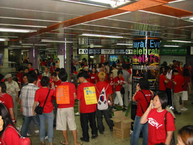 In den U-Bahnstationen um den Plaza gab es schon einen unheimlichen Auflauf an Koreanern die sich noch das Gesicht bemalen ließen, Getränke und Essen sowie andere Souvenierartikel einkauften. Alle in rot versteht sich. War schon einiges los!! |