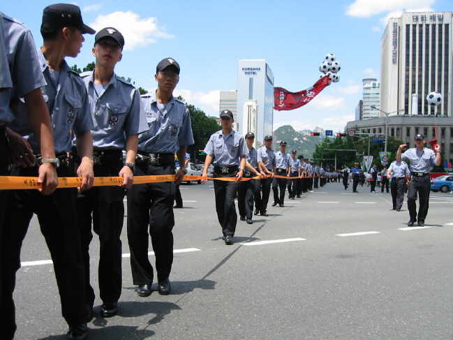 Kurz vor 13 Uhr kam ich am City Hall Plaza an, wo sich schon eine Unmenge an Polizisten und Kamerateams, sowie Fernsehstationen aufhielten. Hier verfolgten bei jedem Spiel der Koreaner gut 250.000 Menschen ihr Team auf gut 5 verschiedenen Großbildleinwänden! |