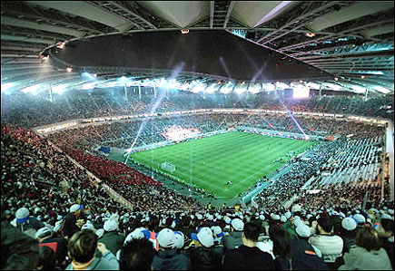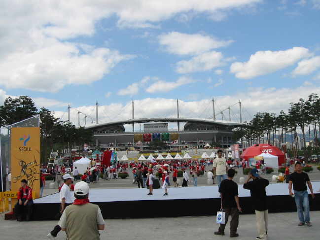 Da war es dann also. Das Seoul World Cup Stadium, in dem die Eröffnungsfeier stattfand und in dem Senegal die Franzosen naß machten und somit gleich einmal die Richtung für die sogenannten “Favoriten” vorgaben..nämlich nach der Vorrunde direkt nach hause!!!!! Dies hier war der Blick auf die Nordseite des Stadions, wo wir Deutschen unseren Eingang N hatten. Der Vorplatz war auf dieser Seite etwas kleiner als der auf der Südseite. |