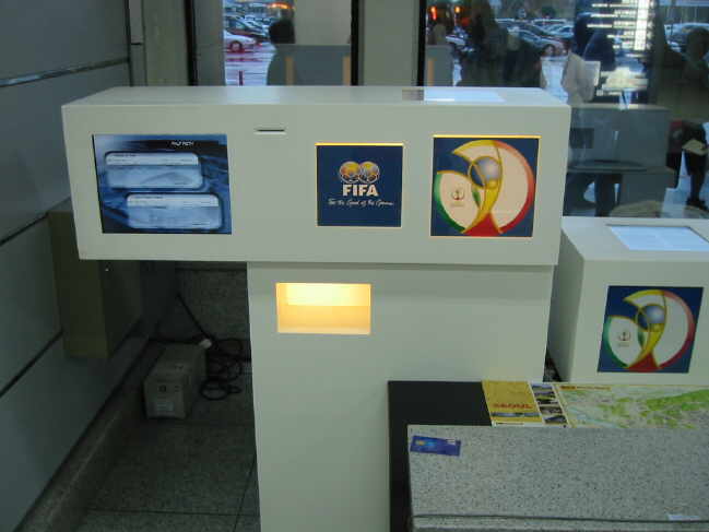 Doch kurz zur kleinen Info. Ich hatte ja alle Karten der DFB-Elf bis ins Finale, doch wusste man ja vorher nicht, wie weit sie kommen würden. Deshalb muste man alle Karten auf Vorkasse bezahlen und bekam ab dem Achtelfinale sogenannte Smart Cards für jedes Spiel zugeschickt. Eine davon seht ihr hier auf dem Foto rechts vorne in blau auf dem Stadtplan. Diese Karte war mit einem Chip versehen, der die persönlichen Daten gespeichert hatte, da man ja den Namen auf das Ticket drucken musste. Es gab die unterschiedlichsten Maschinen für diese Tickets, doch diese hier auf dem Flughafen von Seoul war von allen die einfachste. Man musste nur die Karte in den kleinen Schlitz stecken dann links auf dem Screen die Daten checken, OK drücken, und schon kam die gedruckte Karte unten im beleuchteten Fach heraus. Cool, oder ?!! |