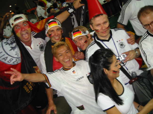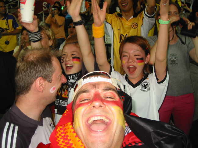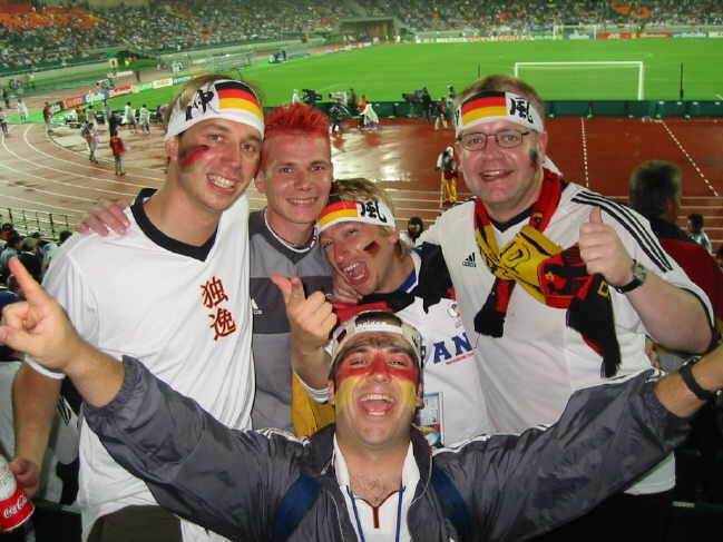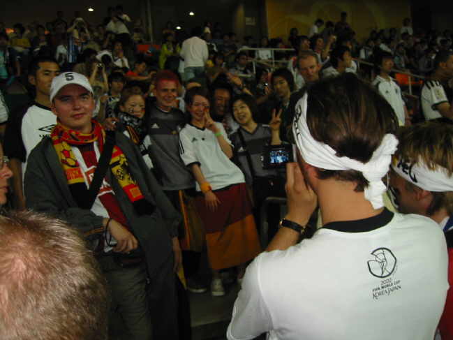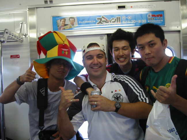 Schon auf dem Weg zum Stadion ging es im Zug bereits lustig her. Ich traf ein paar Japaner, die offensichtlich das falsche Team unterstützten. Na ja, sie hatten ja nach dem Spiel nichts mehr zu lachen, deshalb ließ ich ihnen den Spaß und feierte etwas vor dem Spiel mit ihnen bis zur Endstation. |