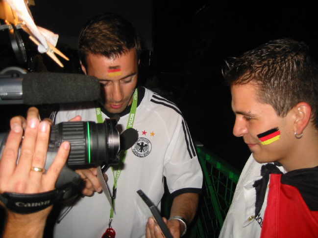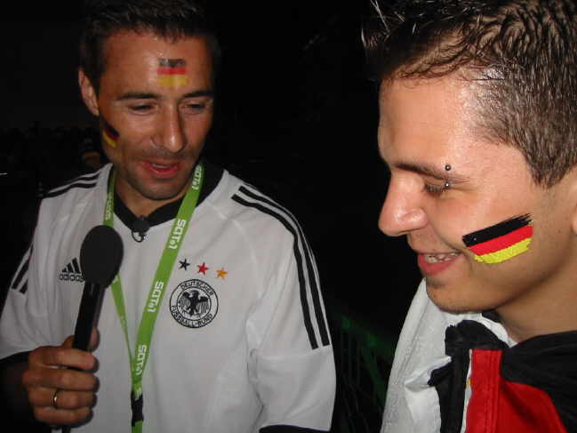 Und dann steh ich so in der Gegend herum neben einem deutschen Fan und plötzlich gehen die Scheinwerfer an und Kai Pflaume steht vor mir. Gibts ja gar nicht!!! Drehen die hier doch glatt ne Liebesschnulze von “Nur die Liebe zählt!” Der Typ, ich glaub Andreas hiess der, oder so, durfte sich dann ein Video von der Schnecke anschauen und dann entscheiden. Ich hab auch gleich meine Videokamera mitlaufen lassen. |