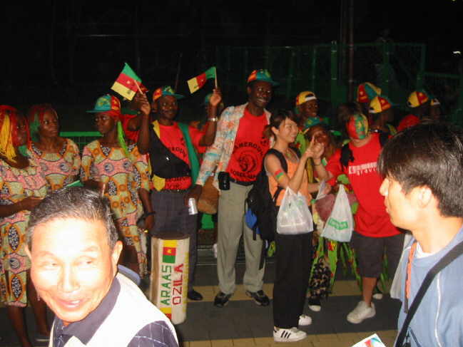 In der Nähe des Haupteingangs wartete ich auf Anne und Doro. Dort traf ich auch einige Kameruner, die etwas Stimmung machten. Von ihnen waren auch recht wenig vertreten. |