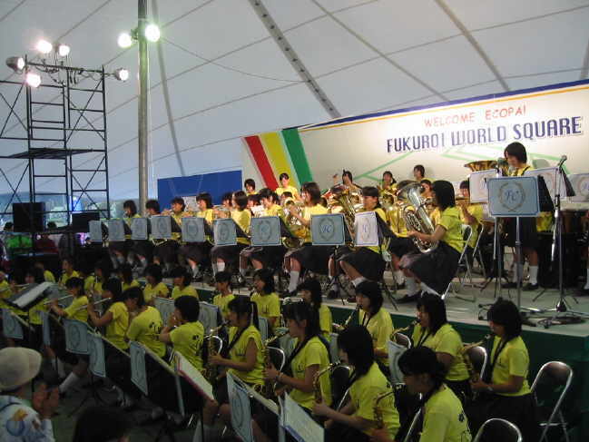 Im Hauptzelt gab es ein großes Programm mit Aufführungen. Hier spielte eine Mädchen High School Band, die recht gut waren und flotte Musik spielten. |