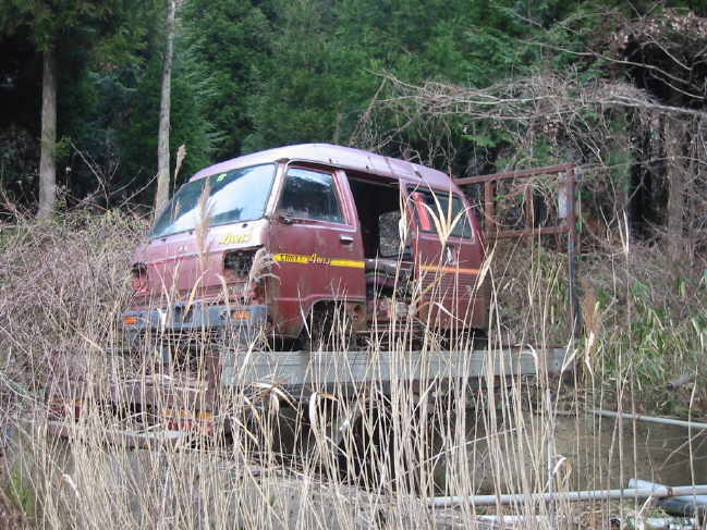 Auch hier das gleiche Bild. Neben der Straße vergammelt ein Kleinbus. Keiner kümmert sich darum! |